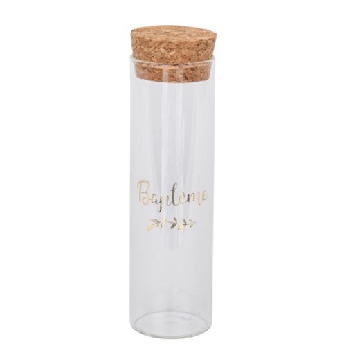 Eprouvette en verre avec bouchon liège et écriture dorée « Baptême ».